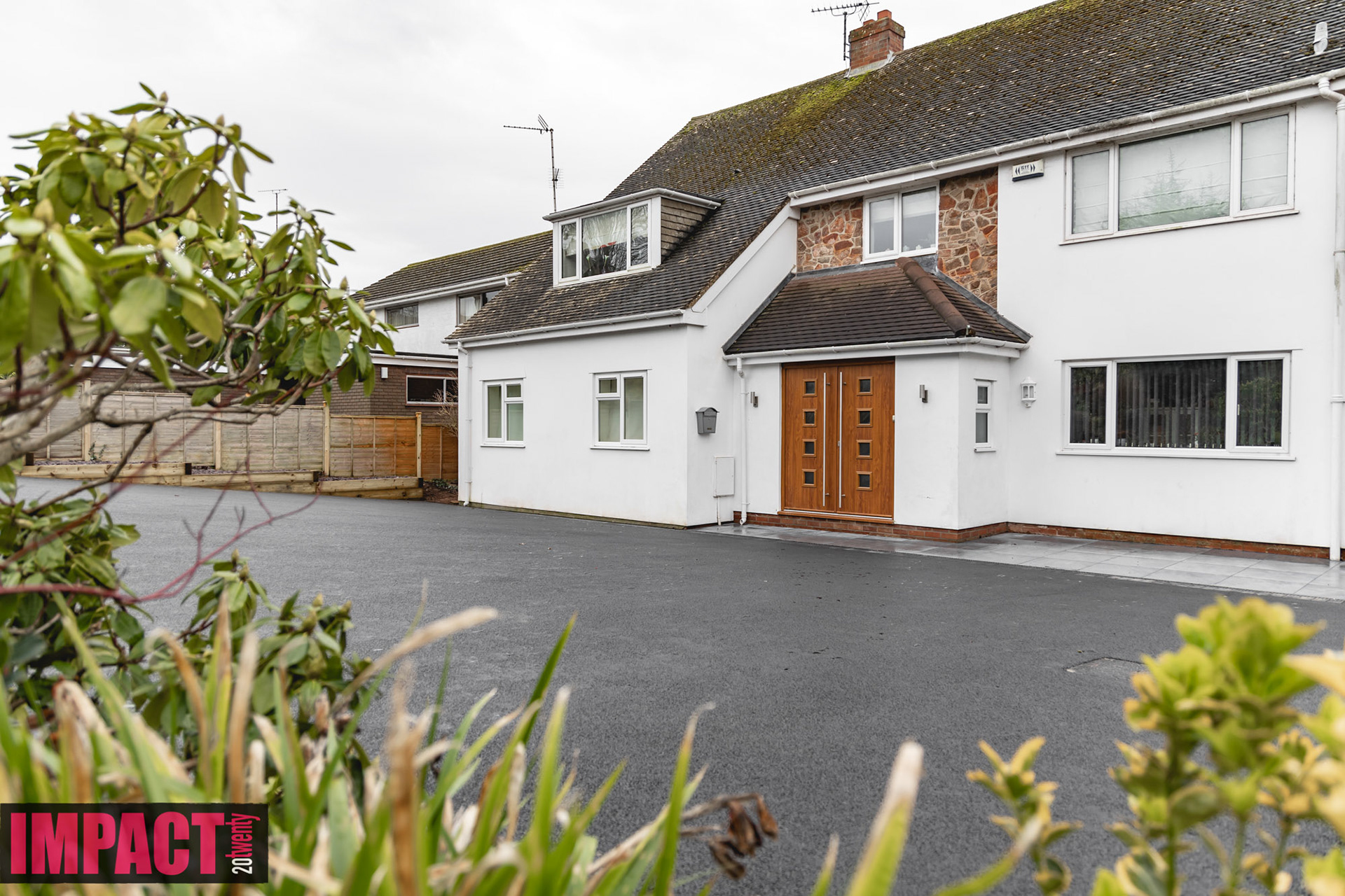 Classy looking tarmac completed by matching black brick edging leading to stunning paving slabs at the home entrance with drainage and sleeper planters by one of our clients, AW Groundworks, for whom we are currently building a new website.